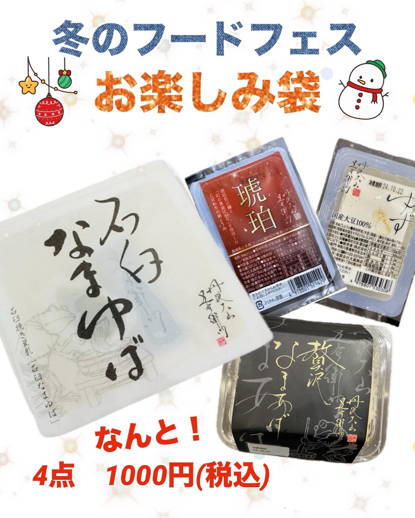 ✨小田急町田店限定開催✨ 本日、1日限定でお楽しみ袋を販売いたします🎁 人気のお豆腐、湯葉、なまあげが入った お楽しみ袋を1セット¥1000(税込) 50袋限定でご用意しております🎁 1日限定販売となります。 是非この機会にご利用下さい😊 スタッフ一同皆様のご来店お待ちしております😊 #小田急町田店 #冬のフードフェス #お楽しみ袋 #五右衛門豆腐 #50袋限定販売