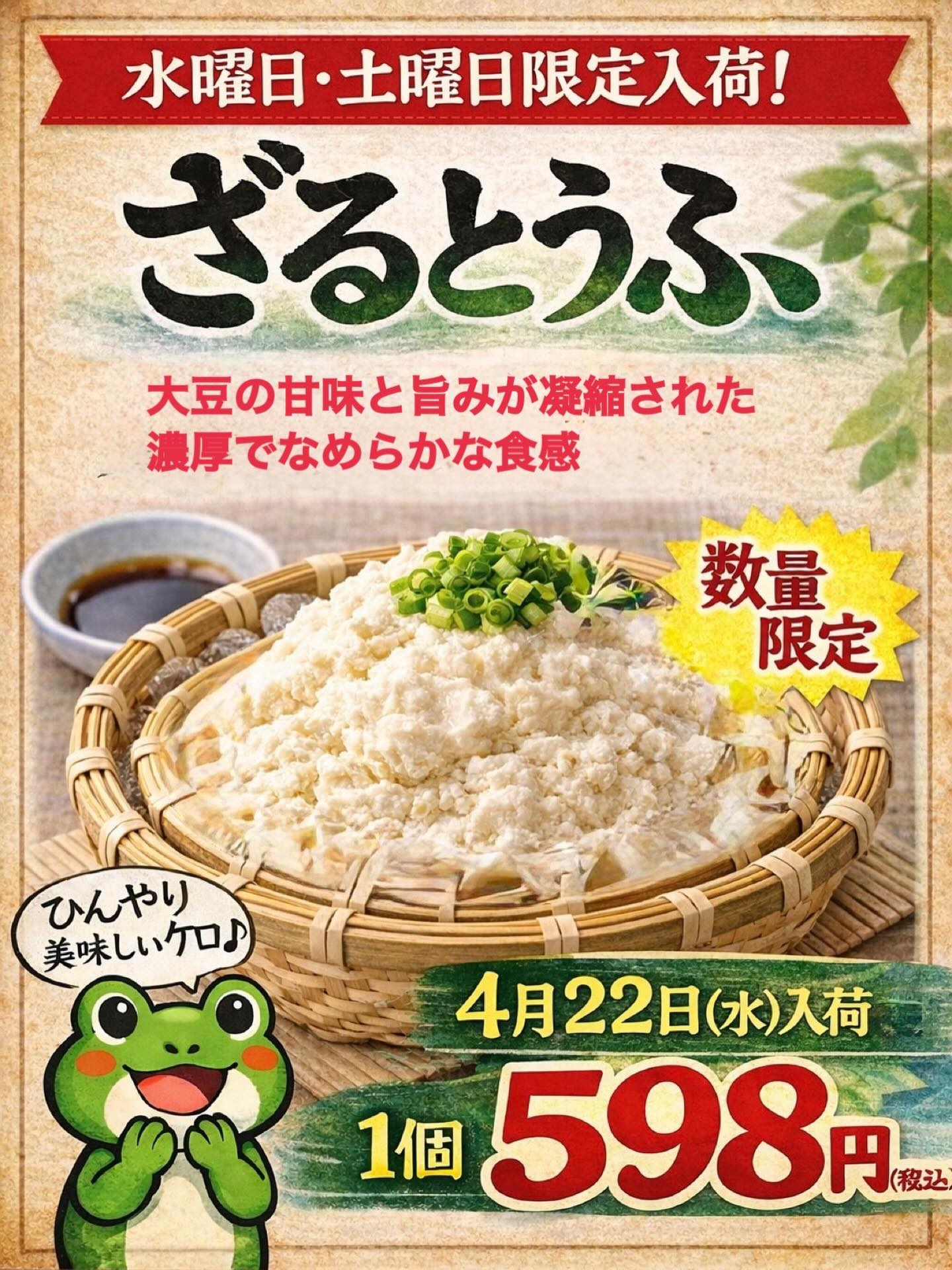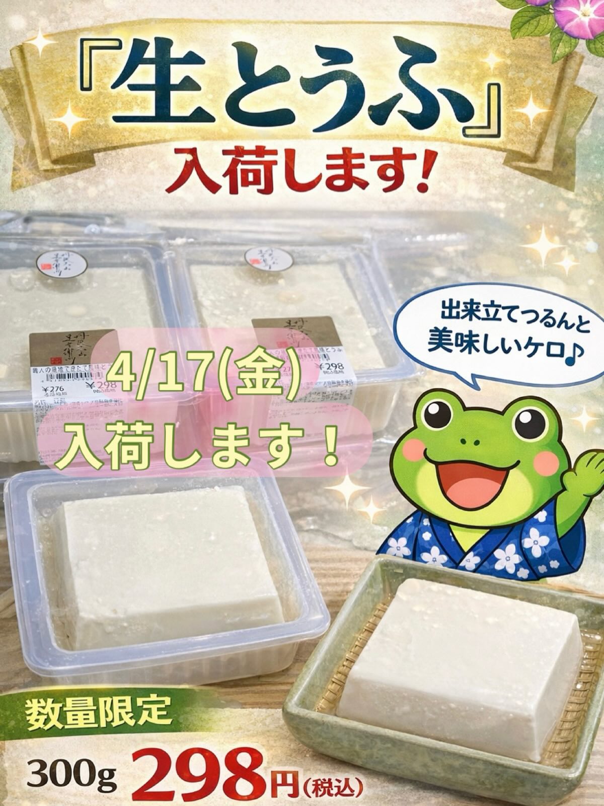 \明日限定入荷🔥/ 売り切れ必至の人気商品! 「生とうふ」入荷します✨ ひと口食べると違いが分かる。 濃厚な大豆の甘みと、なめらかな口あたり。 リピーター続出です🐸 数量限定なので 気になる方はお早めにご来店ください💨 【生とうふ】 300g 298円(税込) 明日はぜひお見逃しなく🐸 #生とうふ #小田急町田店 #マルイ国分寺店 #五右衛門豆腐 #限定入荷