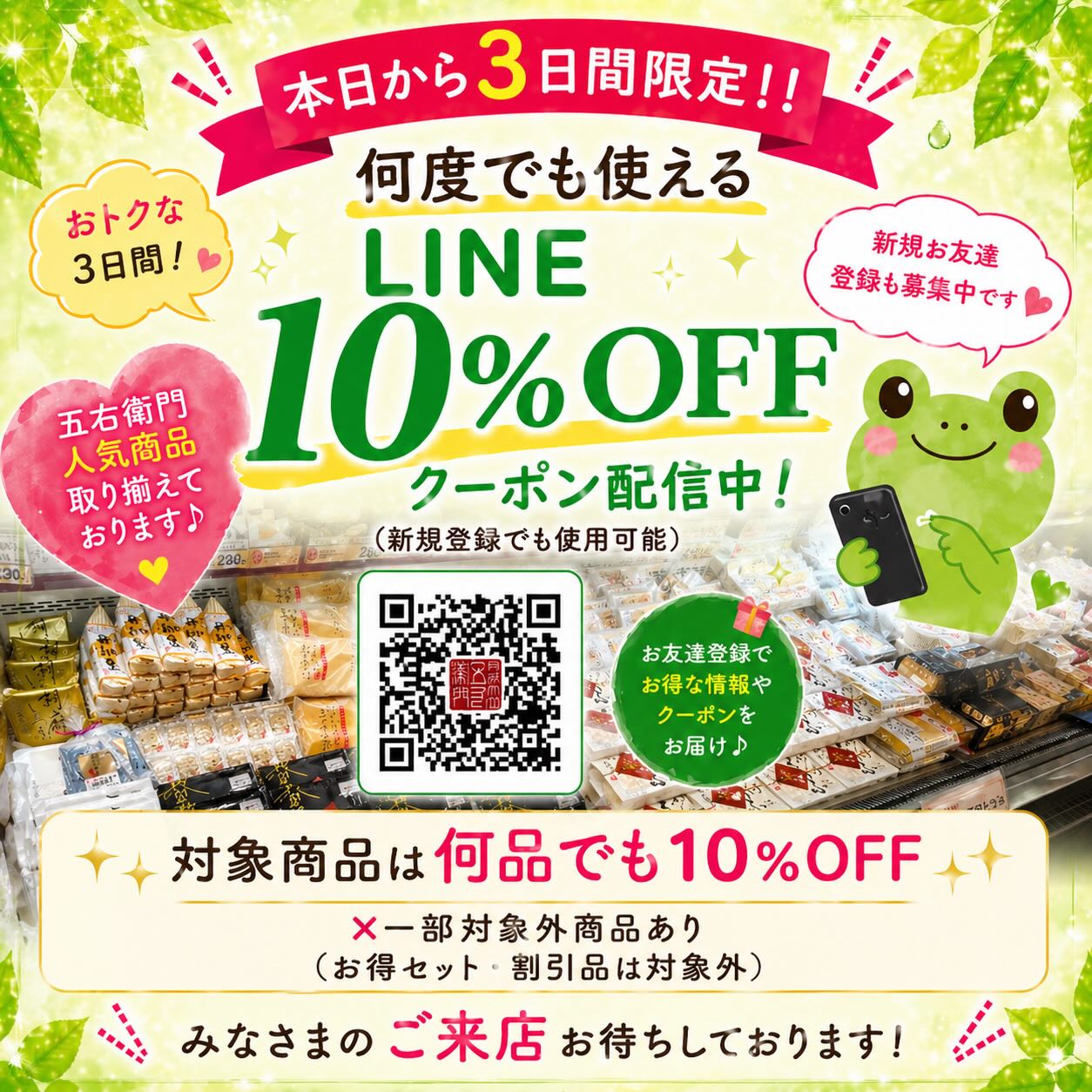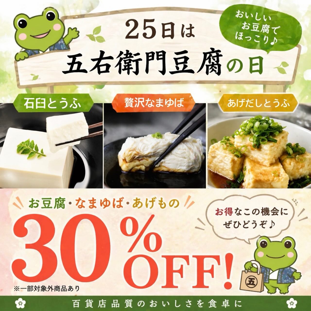 ✨本日15日は \五右衛門豆腐の日/✨ 人気のお豆腐・なまゆば・あげものが なんと30%OFF‼️ 毎日食べたい定番商品も、 ちょっと贅沢な一品も お得に楽しめるチャンスです😊 「今日は何にしよう?」そんな日は ぜひ五右衛門のお豆腐で食卓を✨ ※一部対象外商品がございます 🛍数量に限りがある商品もございますので お早めのご来店がおすすめです! ご来店お待ちしております🐸 #五右衛門豆腐の日 #小田急町田店 #マルイ国分寺店 #百貨店グルメ #本日限定