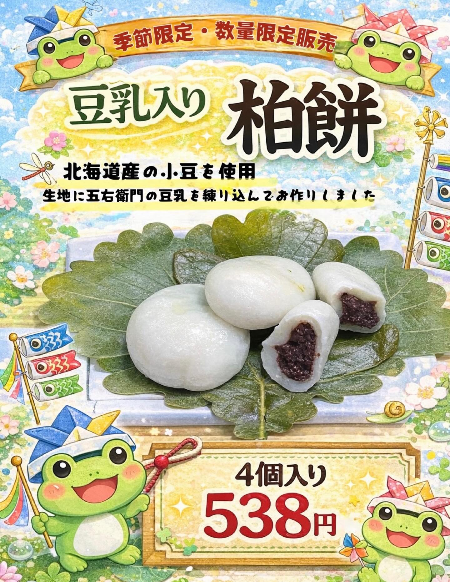 \ぴょこんと登場🐸/ 豆乳入り柏餅、入荷しました! ふんわりやわらか〜いお餅に、 やさしい甘さの餡。 豆乳入りでコクがあるのに、後味はすっきり♪ 🐸「きょうのおやつ、これにする〜?」 柏の葉の香りと一緒に、 初夏の味わいをぜひお楽しみください🌿 数量限定なので、お早めにどうぞ! ご来店お待ちしております🐸 #柏餅 #豆乳スイーツ #和菓子好き #五右衛門豆腐 #和スイーツ