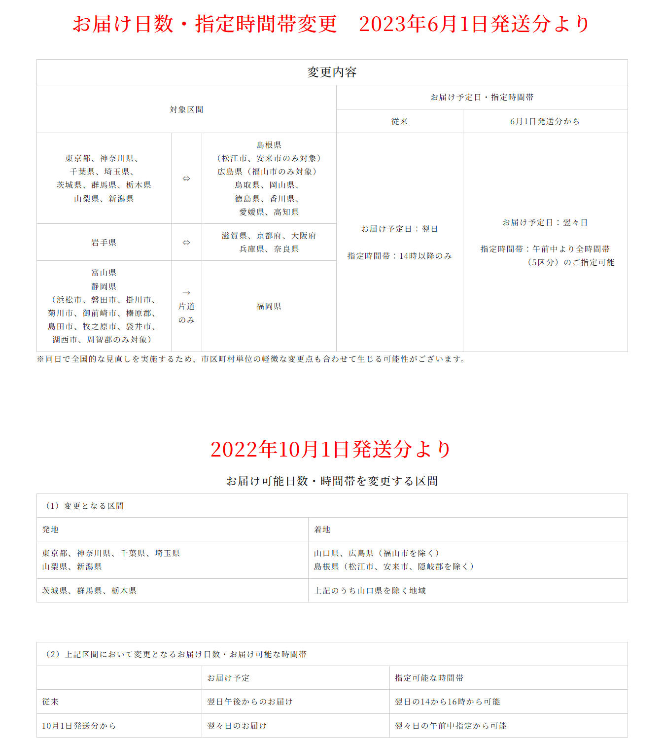 お届け日数・指定時間帯変更のお知らせ